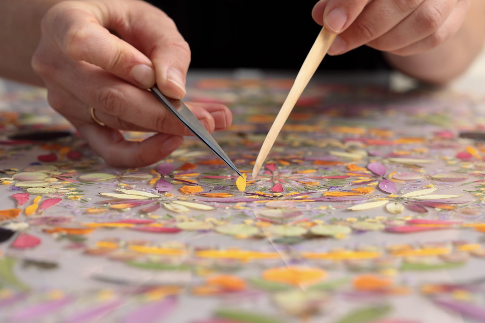 The artist has long worked with botanicals and other organic materials, notably embroidering foraged leaves and feathers with meticulous geometric designs. With the series Portraits of Place, which she’s been pursuing for the past six years, Fayle precisely arranges individual petals and leaves into intricate, symmetrical, mandala-like compositions on acrylic.