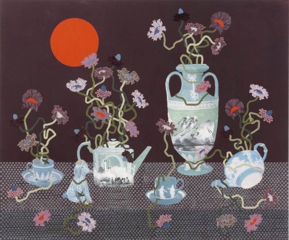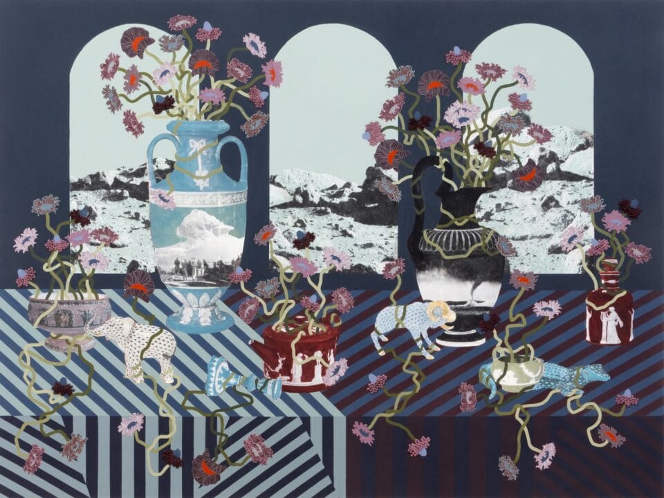 The vivid works feature flat backdrops met by boldly striped or floral linens and a menagerie of animals seized by fresh blooms. A marble and dust emulsion, which Gill layers on the acrylic-painted panel with a baker’s piping tool, adds a life-like texture to the petals. She also utilizes an image-transfer process to translate various pieces from her mother’s porcelain collection, further enmeshing her works in domestic traditions.