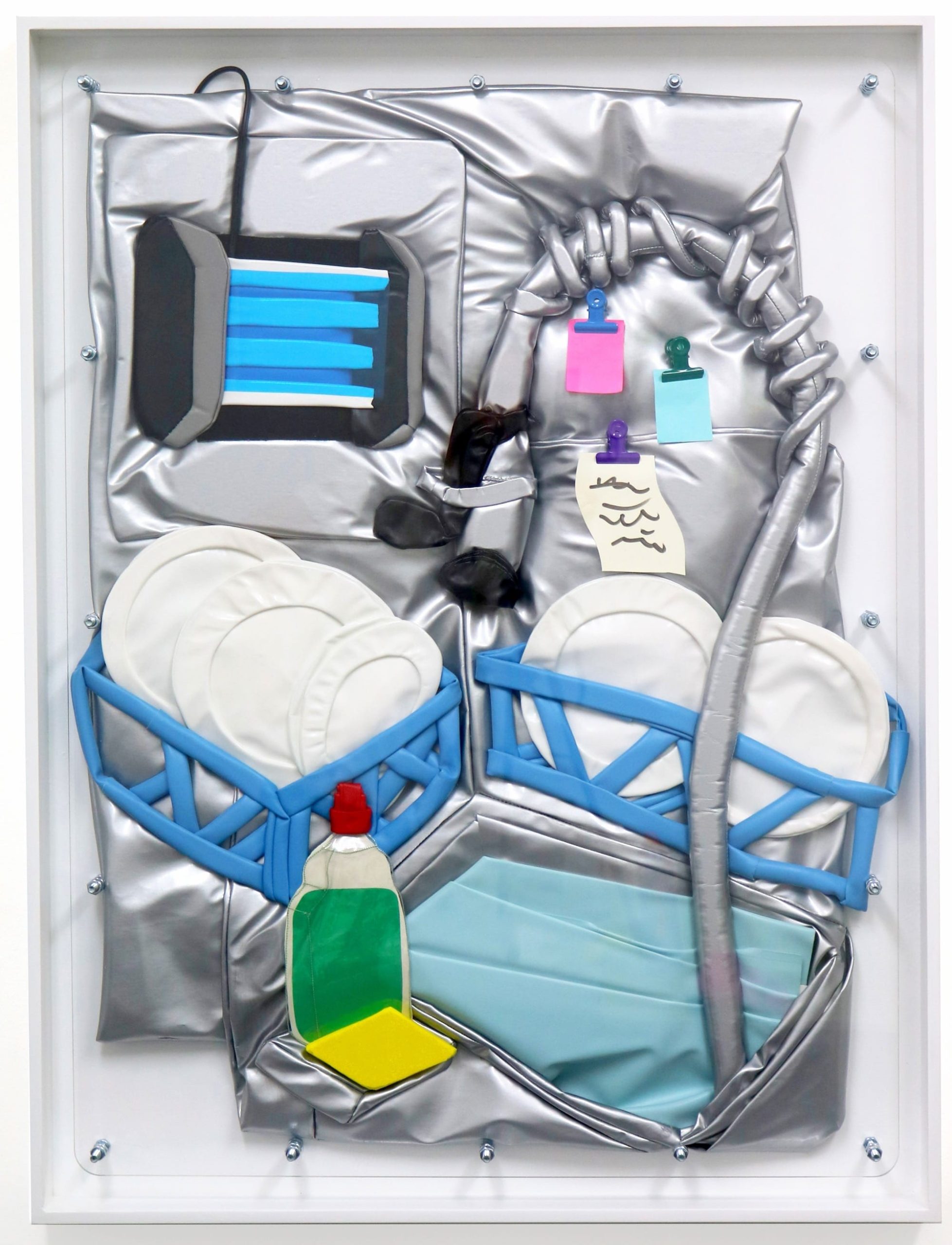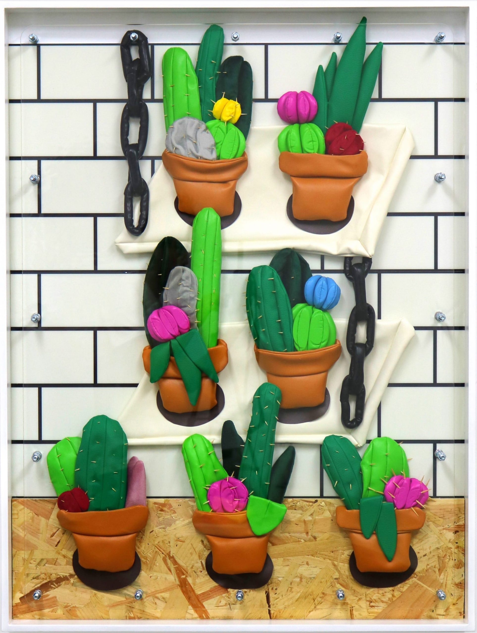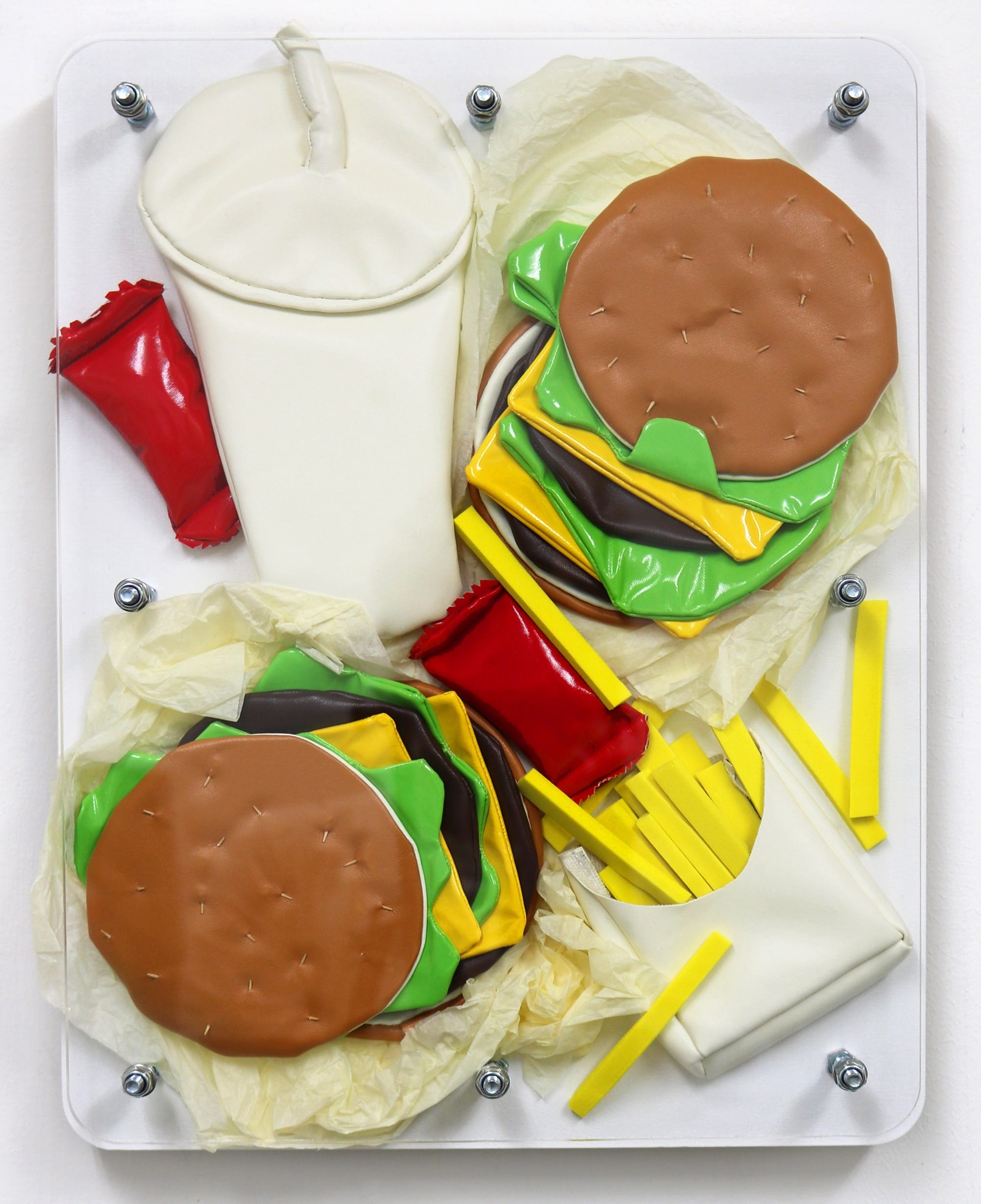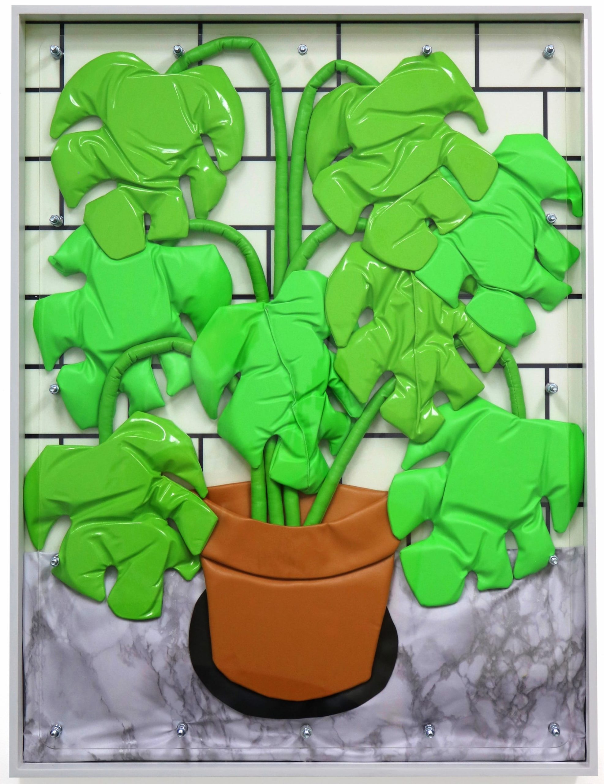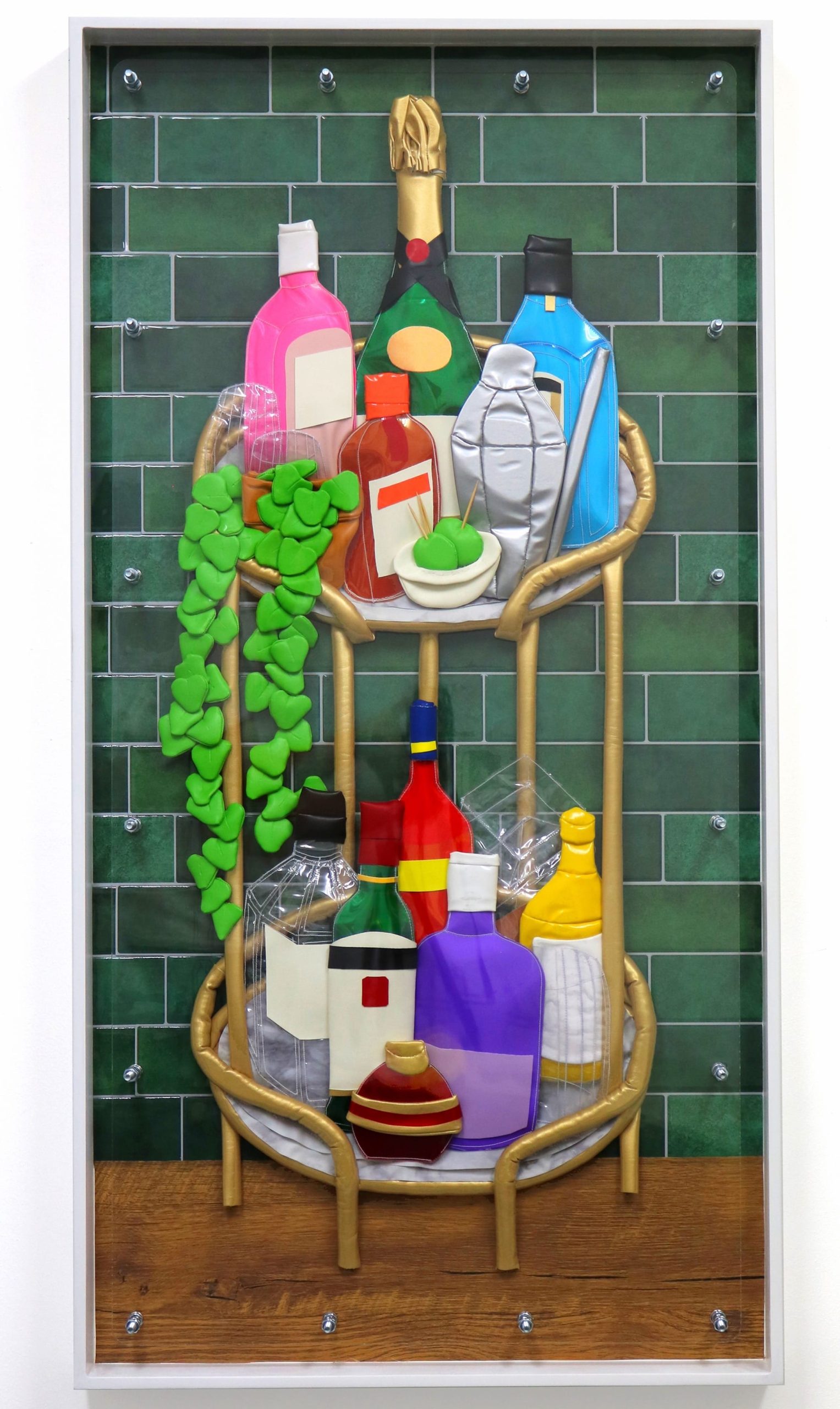 Nodding to genres in Western art like vanitas still-life paintings, he creates textile reliefs that tap into our contemporary condition. From fast food to houseplants to a vibrant bar cart, his compositions playfully explore themes of indulgence, impermanence, beauty, and the quotidian.