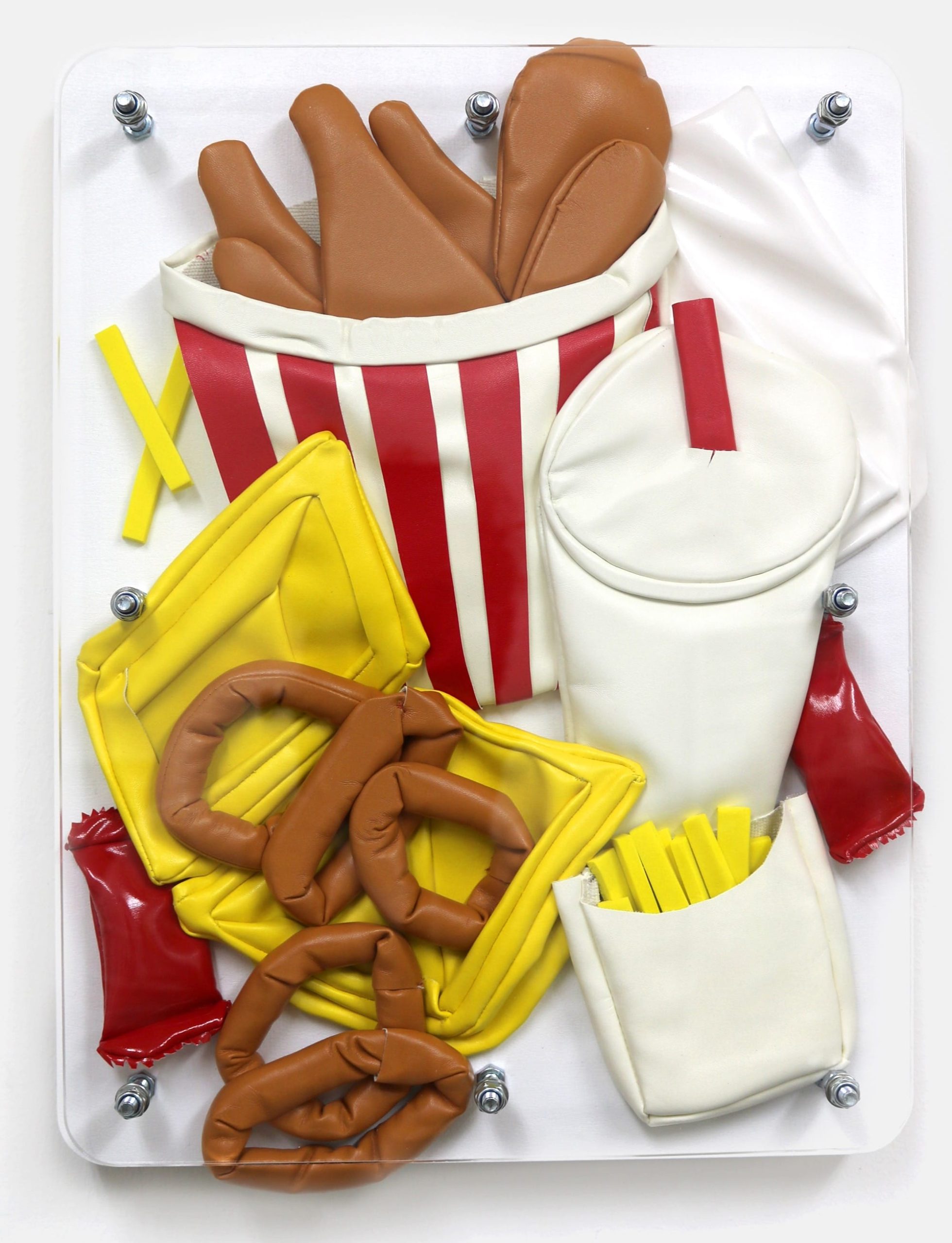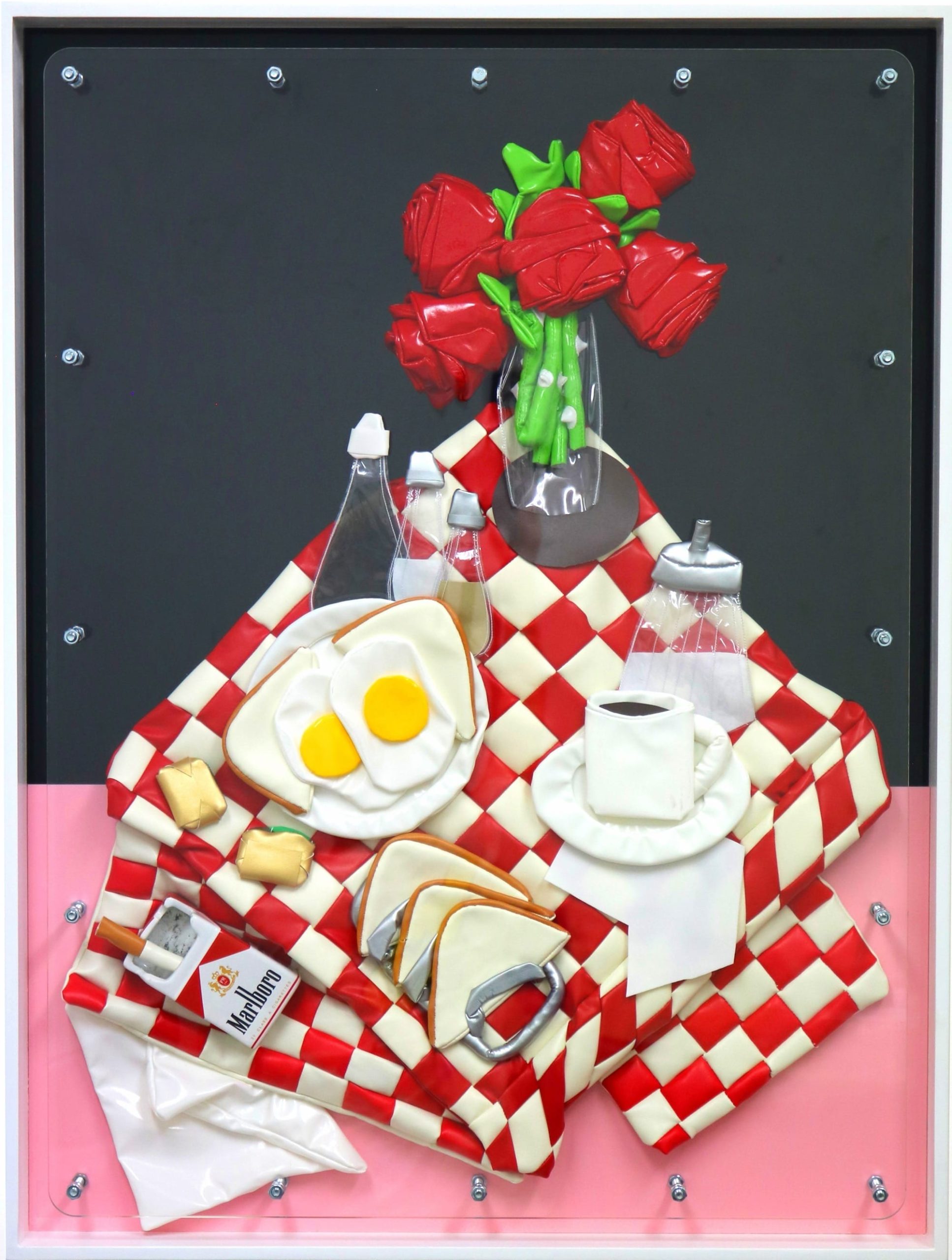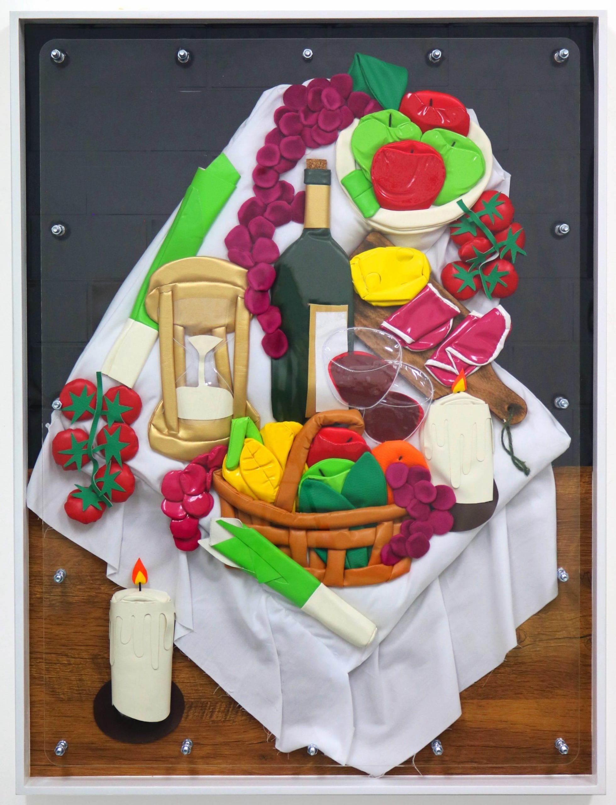 Nodding to genres in Western art like vanitas still-life paintings, he creates textile reliefs that tap into our contemporary condition. From fast food to houseplants to a vibrant bar cart, his compositions playfully explore themes of indulgence, impermanence, beauty, and the quotidian.